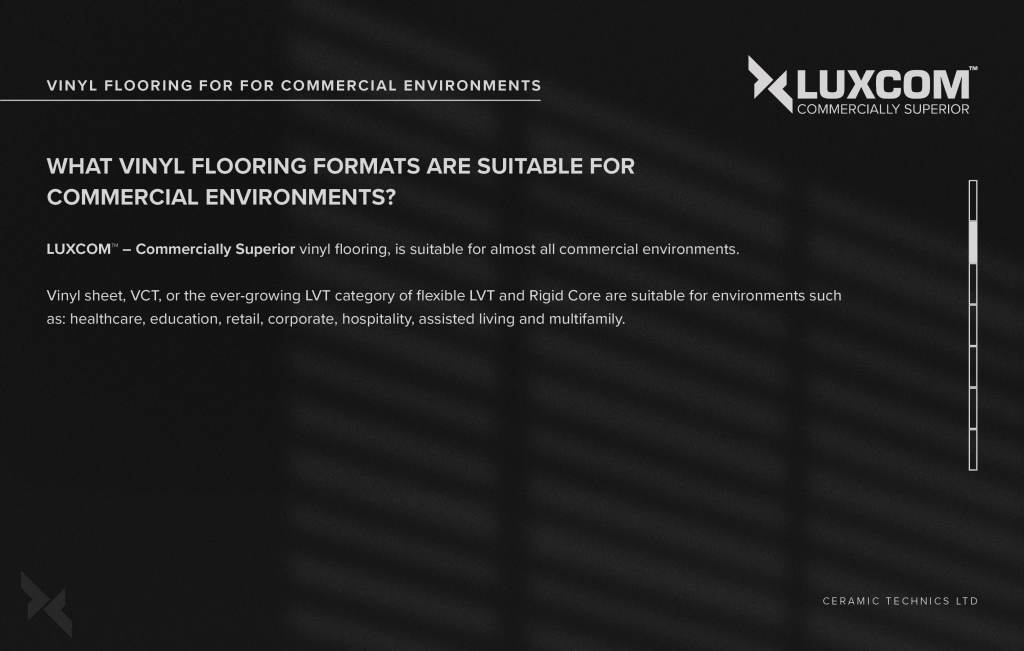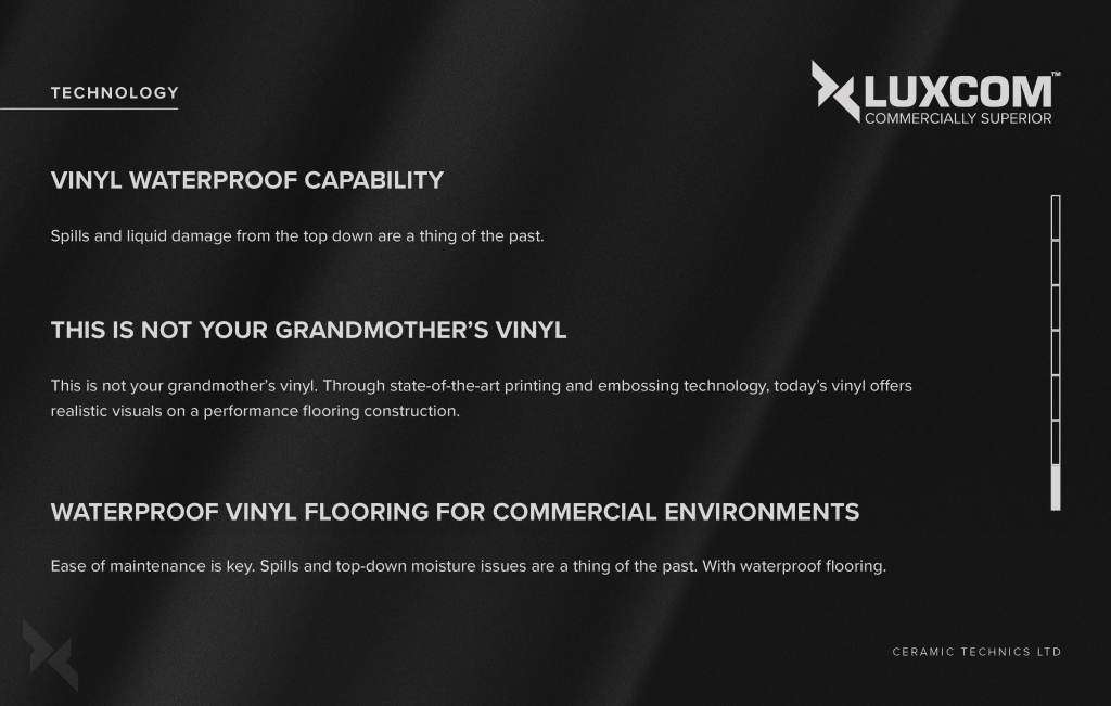 As Creative Lead at Ceramic Technics Ltd, I developed the LUXCOM brand: an LVT sub-brand built from the ground up. I led the naming process, crafted the visual identity, designed the logo, and created the brand architecture to support multiple product lines. From initial concept to final rollout, I directed the visual language, copy tone, product structure, and supporting collateral. The project included marketing research, competitor positioning, trademark vetting, and creative direction for photography and presentation materials, all driven by a focus on commercial application and brand clarity.