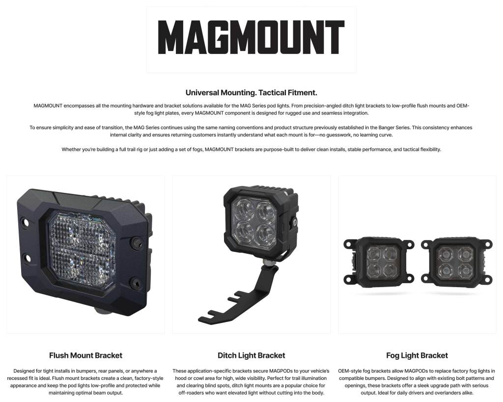 Led the strategic development of the MAG Series, an all-new off-road lighting line under Morimoto. This included conducting competitive market analysis, identifying naming opportunities, and building a product structure that mirrors customer needs and industry standards. I created the MAG brand name, developed its sub-brand architecture (MAGPOD, MAGPOD, MAGLENS, etc.), and designed the logo system to reflect a bold, tactical identity. The result: a scalable, cohesive product family that stands out in a saturated market.